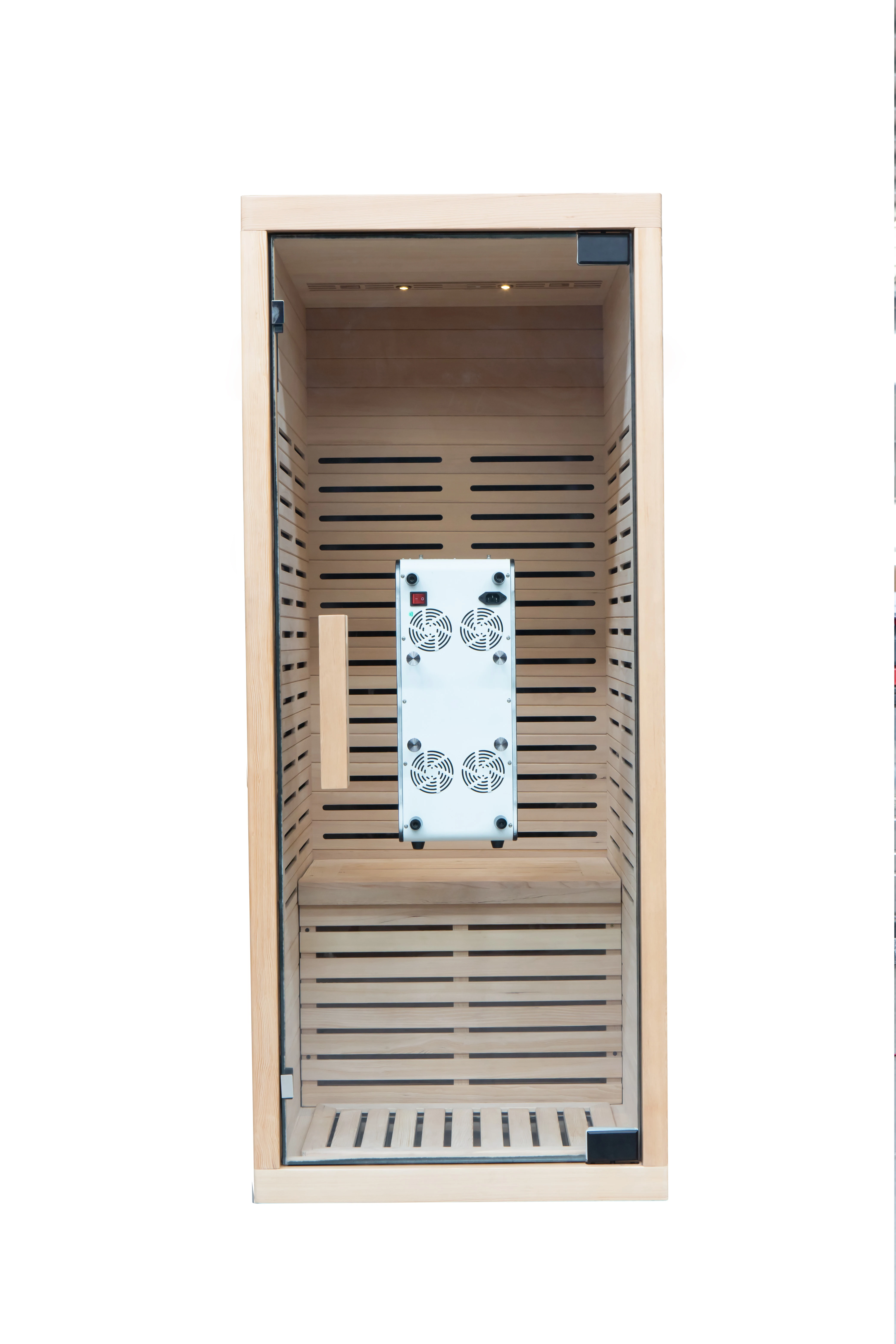 The room is made with safe, pleasant materials and a clean, modern look. A soft wood interior, tempered glass door and ergonomic bench give a calm space to relax. The layout keeps the heating panels out of direct contact so the room is safe and comfortable for users of many ages. Ventilation options and adjustable vents help keep air fresh while preserving heat