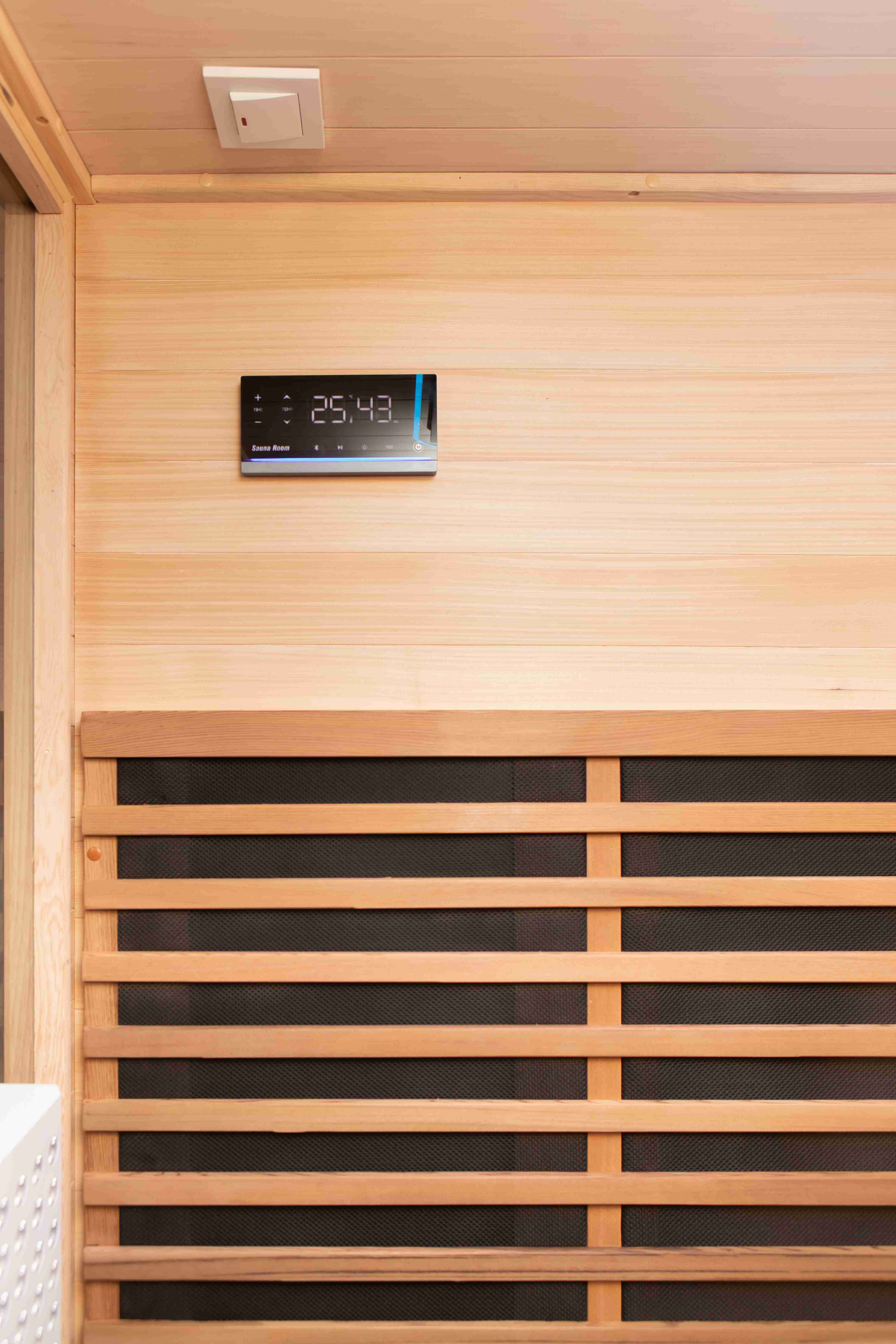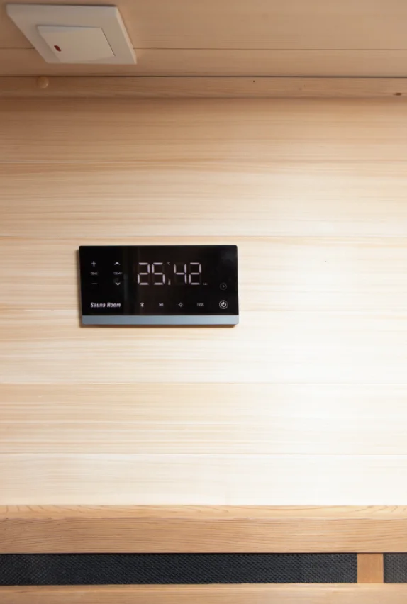 Управление простое. Встроенный пульт дистанционного управления через приложение позволяет запускать предварительный нагрев со смартфона, чтобы сауна была готова к вашему приходу. Установите температуру, таймер и время начала одним касанием. Приложение работает через Wi-Fi и поддерживает программируемый предварительный нагрев, чтобы ваша процедура начиналась в нужный момент без ожидания. Интуитивно понятное управление также включает простые кнопки на устройстве для быстрого использования