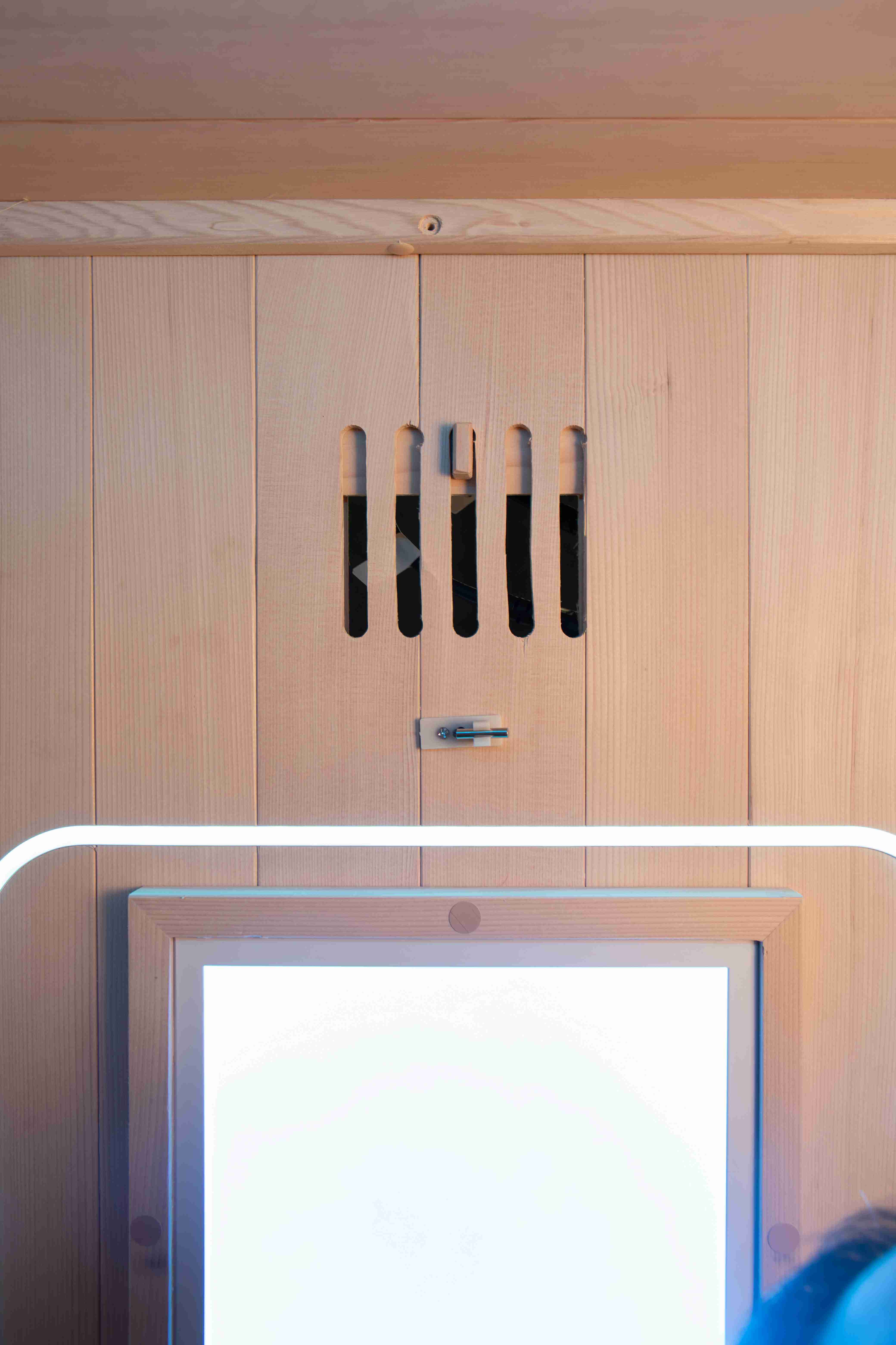Комфорт является приоритетом. Внутренняя часть выполнена из гладкой древесины с удобными сиденьями. Дверь и панели плотно прилегают, чтобы удерживать тепло, а вентиляционные отверстия позволяют регулировать поток воздуха. Нагреватели из слюды быстро разогреваются и поддерживают равномерную температуру в сауне, делая сеансы более эффективными и приятными. Небольшая полка и держатель для чашки позволяют держать воду или полотенце в пределах досягаемости