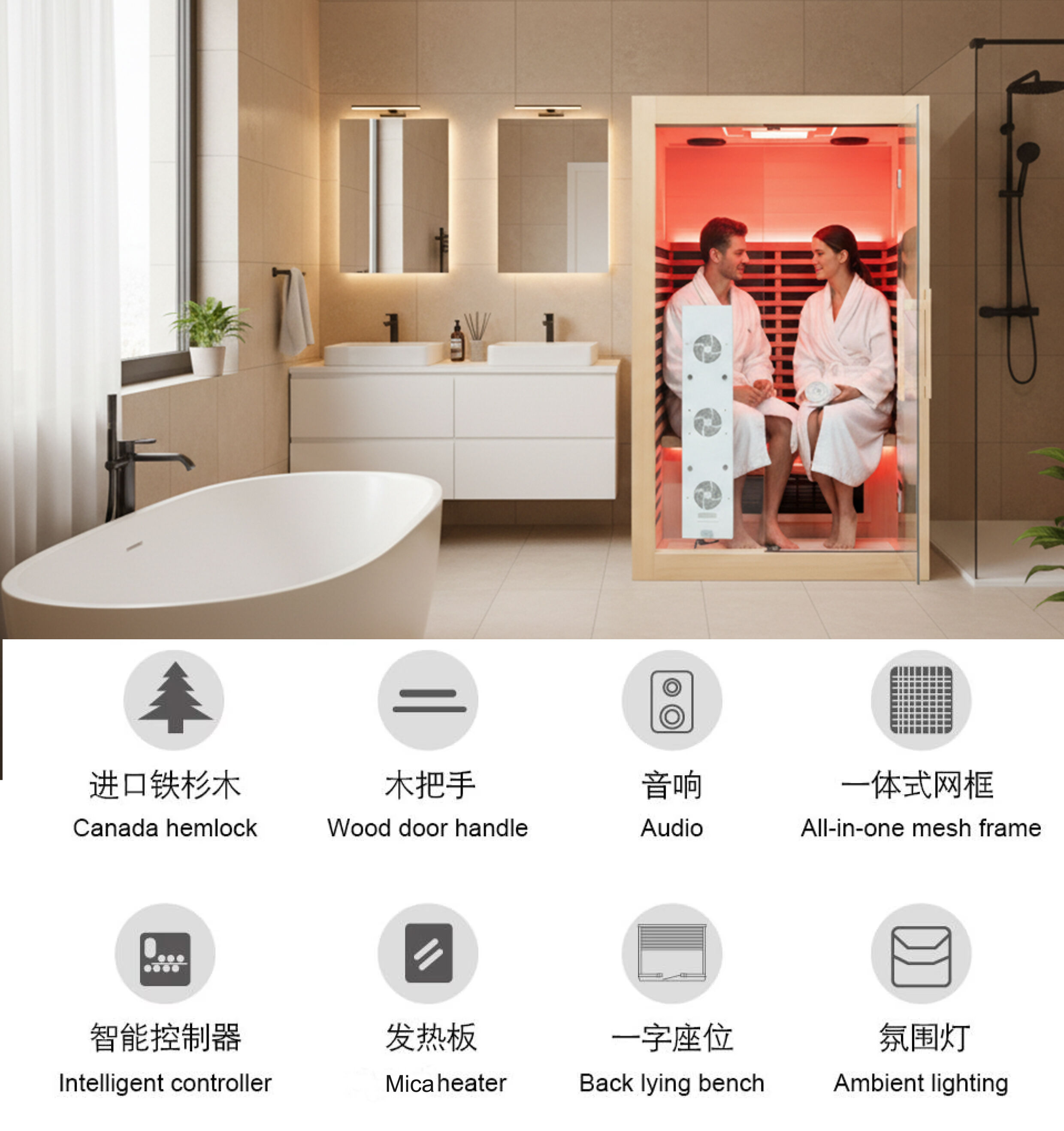 1. Материал: Тсуга/Стекло 2. 5-дюймовая интеллектуальная панель управления 3. Углеродные нагреватели дальнего инфракрасного излучения 4. Закаленное стекло толщиной 60р80мм, 5. Светодиодная подсветка 6. USB-радио, MP3, FM 7. Динамик 8. Лампы для терапии красным светом |