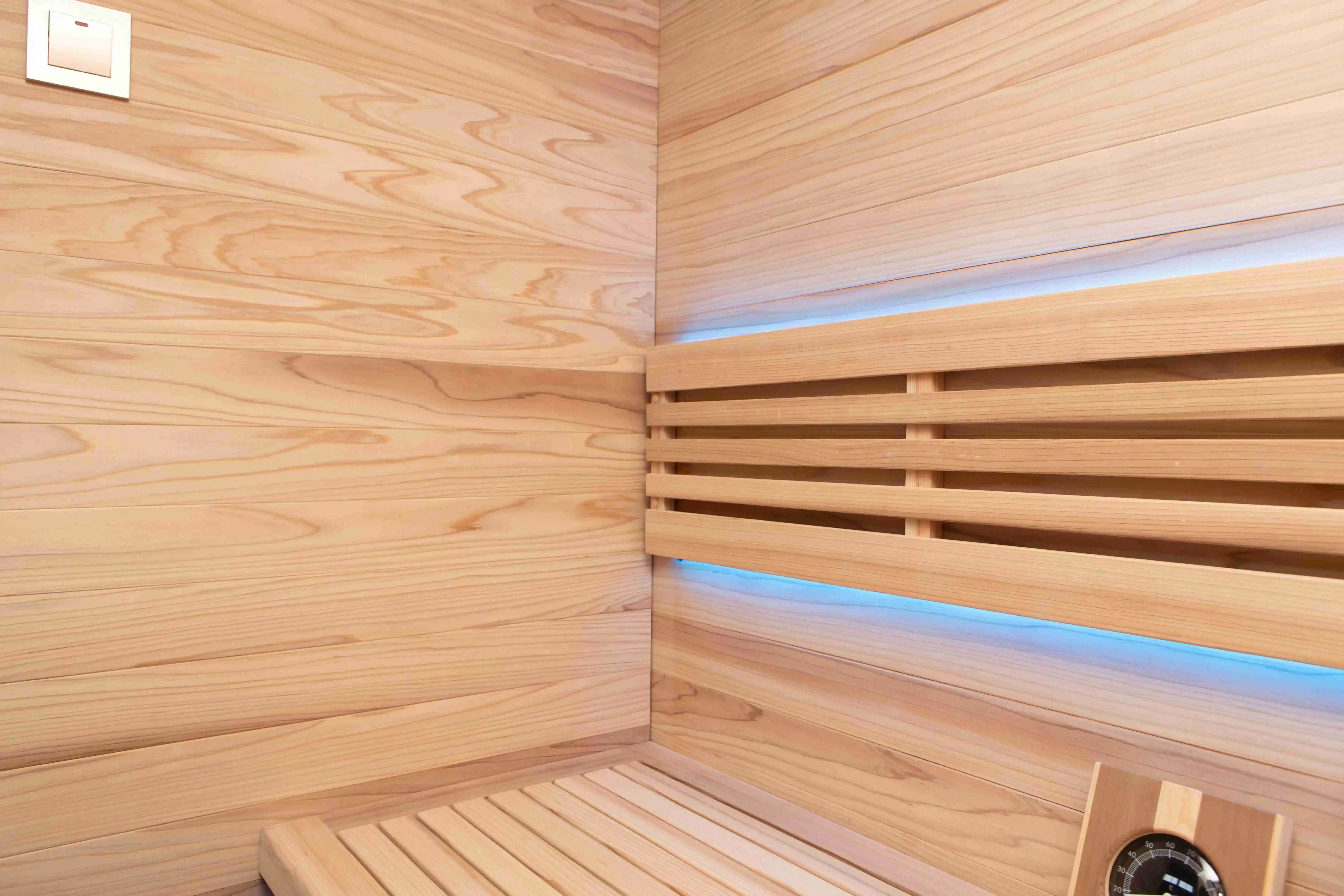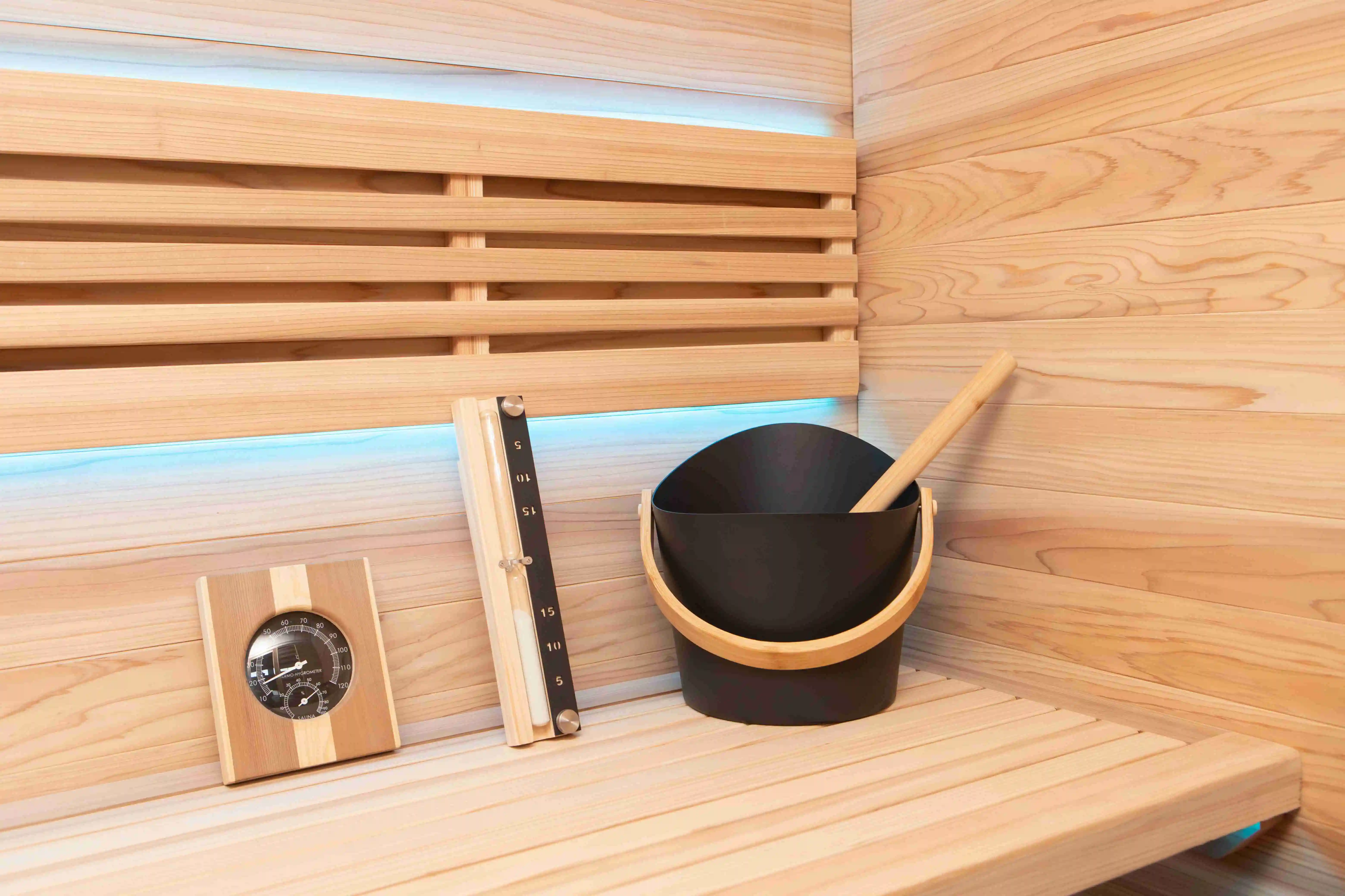 Простые элементы дополняют удовольствие: мягкое светодиодное освещение с возможностью регулировки яркости, небольшая панель управления для каменки и света, а также деревянные спинки, имеющие форму, обеспечивающую комфорт. Двухъярусная посадка оставляет место для небольших предметов, таких как полотенца, бутылка с водой или ёмкость для аромамасел. Сборка проста благодаря понятной инструкции и деталям с маркировкой, а вся необходимая фурнитура включена для быстрой установки