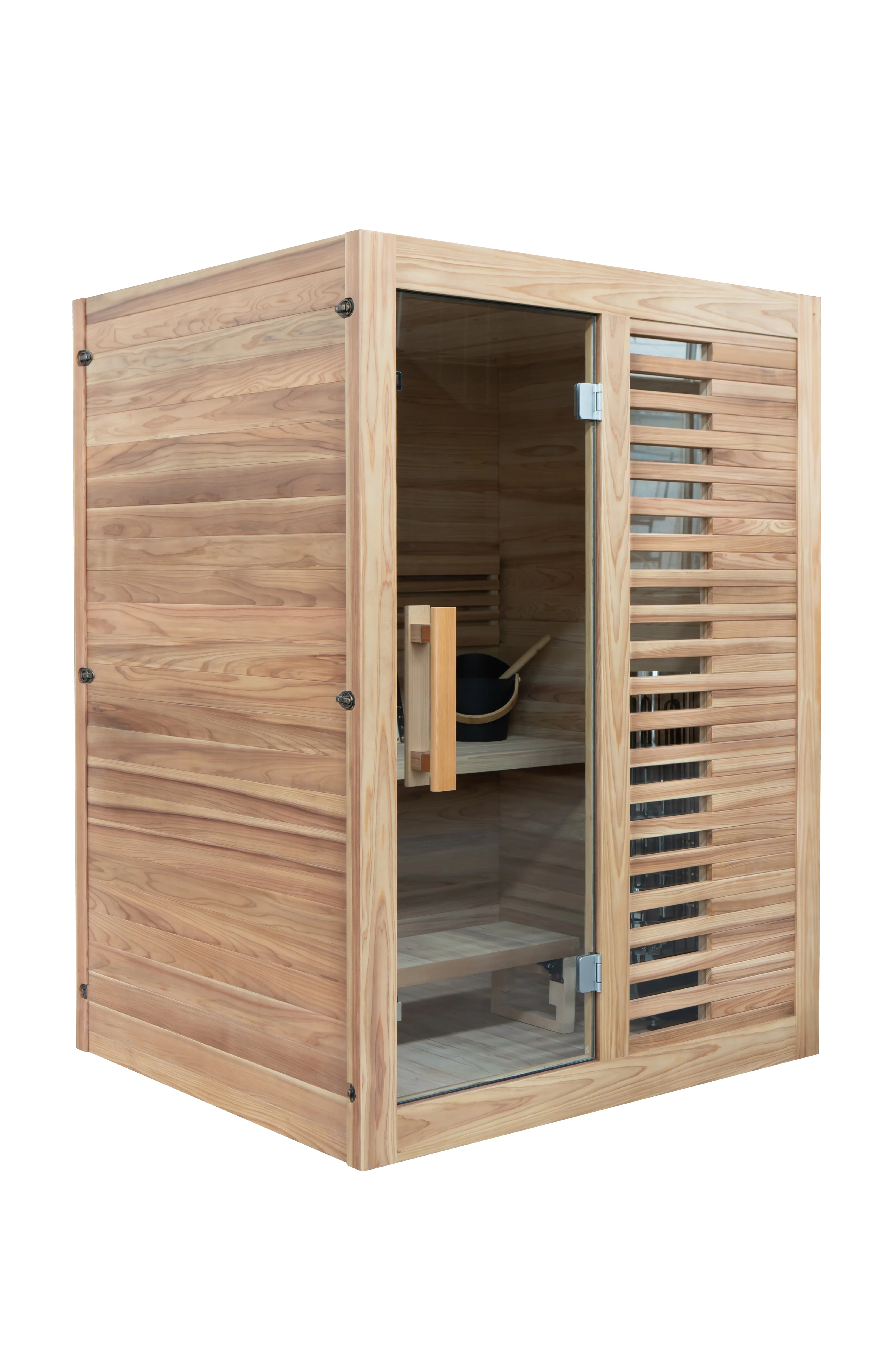 Запатентованный дизайн сочетает чёткие линии с интеллигентной вентиляцией и плотным уплотнением, удерживающим пар, но позволяющим приток свежего воздуха при необходимости. Сбалансированная дверь и окно из закалённого стекла пропускают свет и обеспечивают обзор, сохраняя тепло внутри. Внутренние поверхности гладкие, с закруглёнными краями — безопасны и просты в уходе. Низкое энергопотребление и высокая теплоизоляция помогают снизить эксплуатационные расходы, а кабина быстро нагревается и поддерживает постоянную температуру
