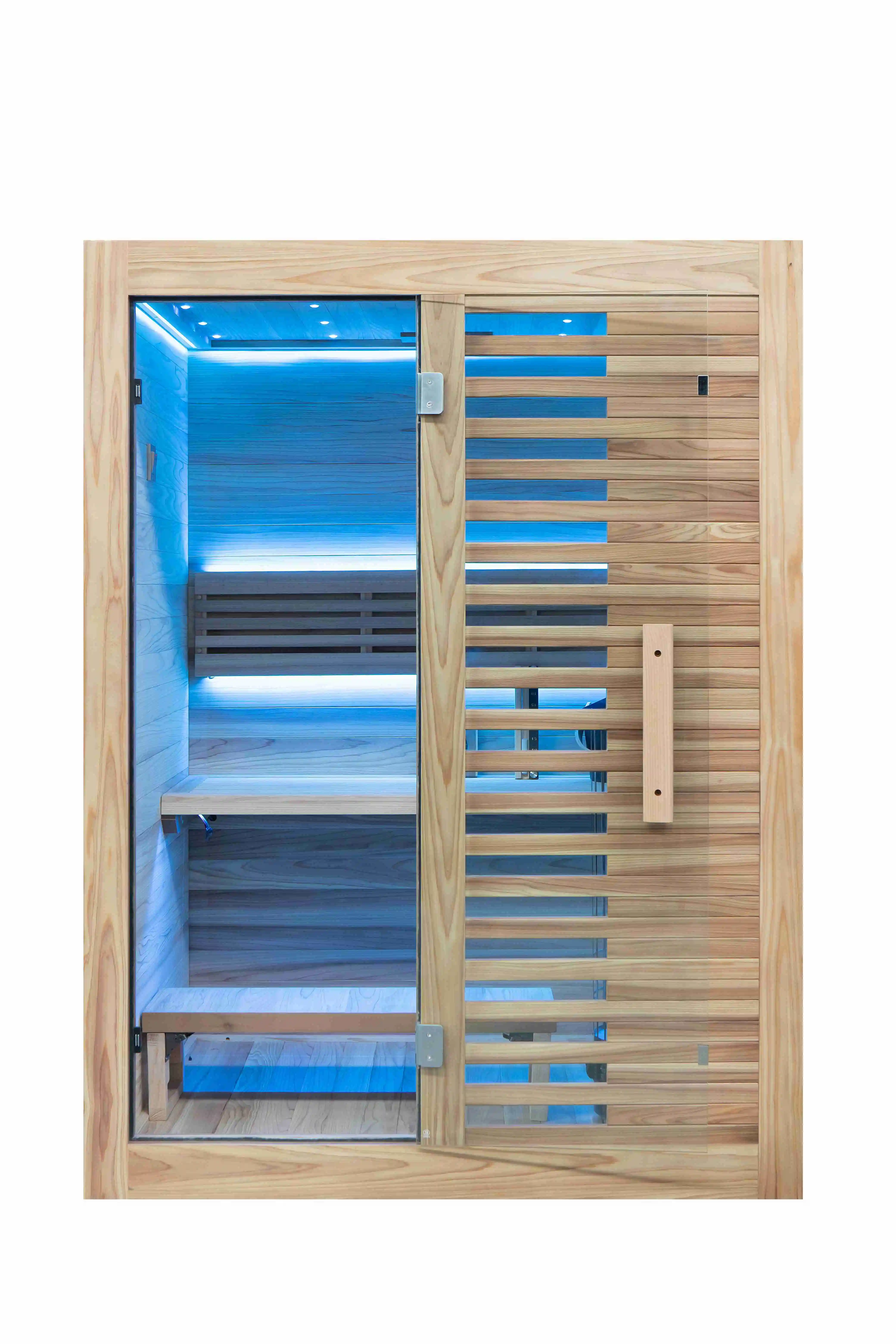 Vhealth представляет эксклюзивный запатентованный дизайн двухместной паровой сауны из цельного дерева, созданной для внесения спокойного и здорового ритуала в ваш дом. Эта сауна удобно вмещает двух человек на эргономически изогнутых скамьях, которые поддерживают расслабленную посадку и даже лёгкое откидывание назад. Панели и рамы из массива дерева выполнены из тщательно подобранной древесины, устойчивой к короблению и сохраняющей тёплую на ощупь поверхность, что придаёт помещению естественный вид и мягким ароматом, способствующим спокойному дыханию и расслаблению