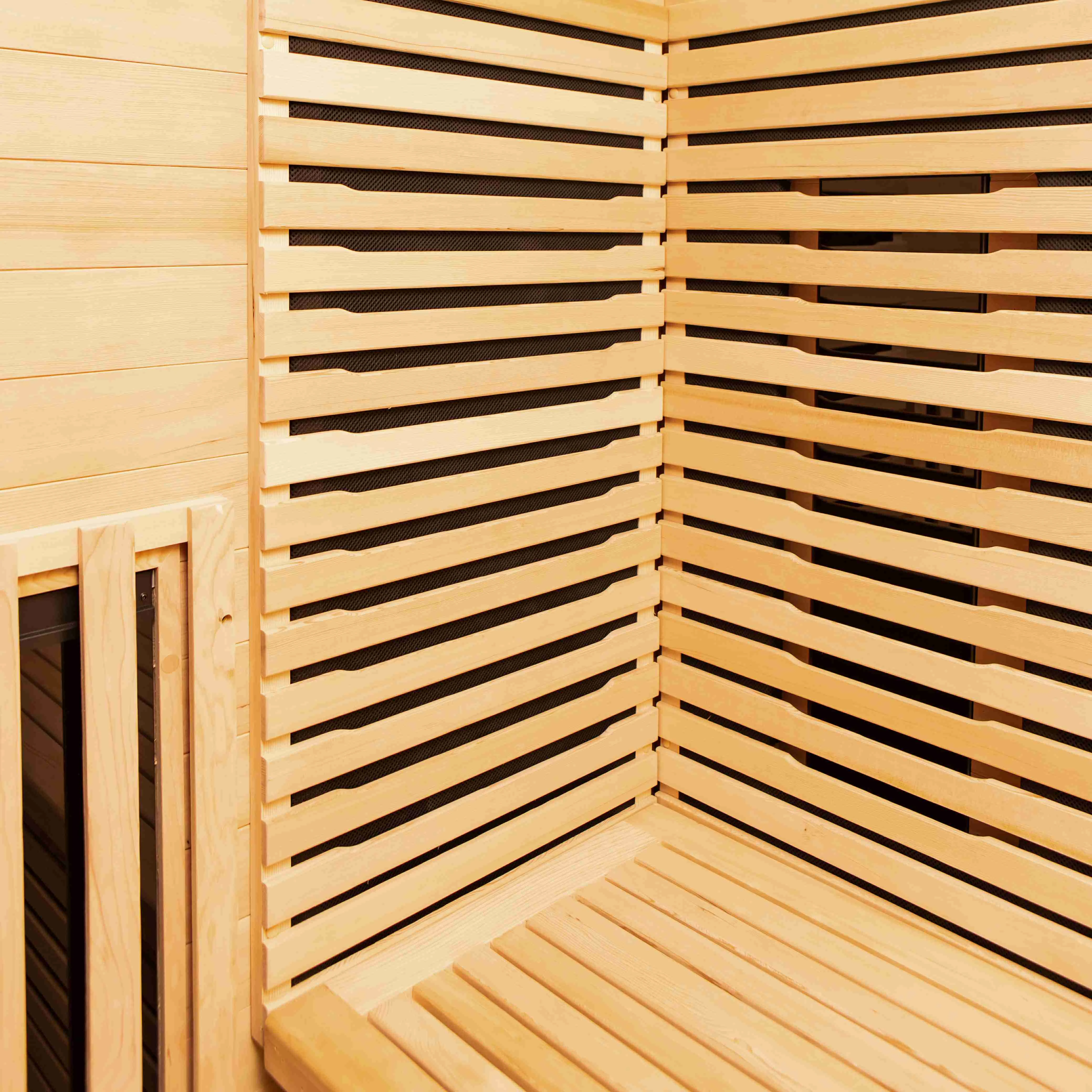 Каждая сауна Vhealth оснащена хорошо расположенными инфракрасными панелями, которые проникают глубоко в мышцы без жесткого воздушного нагрева традиционной сауны. Это позволяет наслаждаться комфортной, более низкой температурой и одновременно получать преимущества глубокой термотерапии. Устройство также имеет хорошую вентиляцию, мягкую внутреннюю подсветку и низкопрофильную систему обогрева, которая устанавливается под скамейками, экономя место. Компактные габариты делают эту модель превосходным оптовым выбором для небольших студий, квартир или домашних спа-комнат