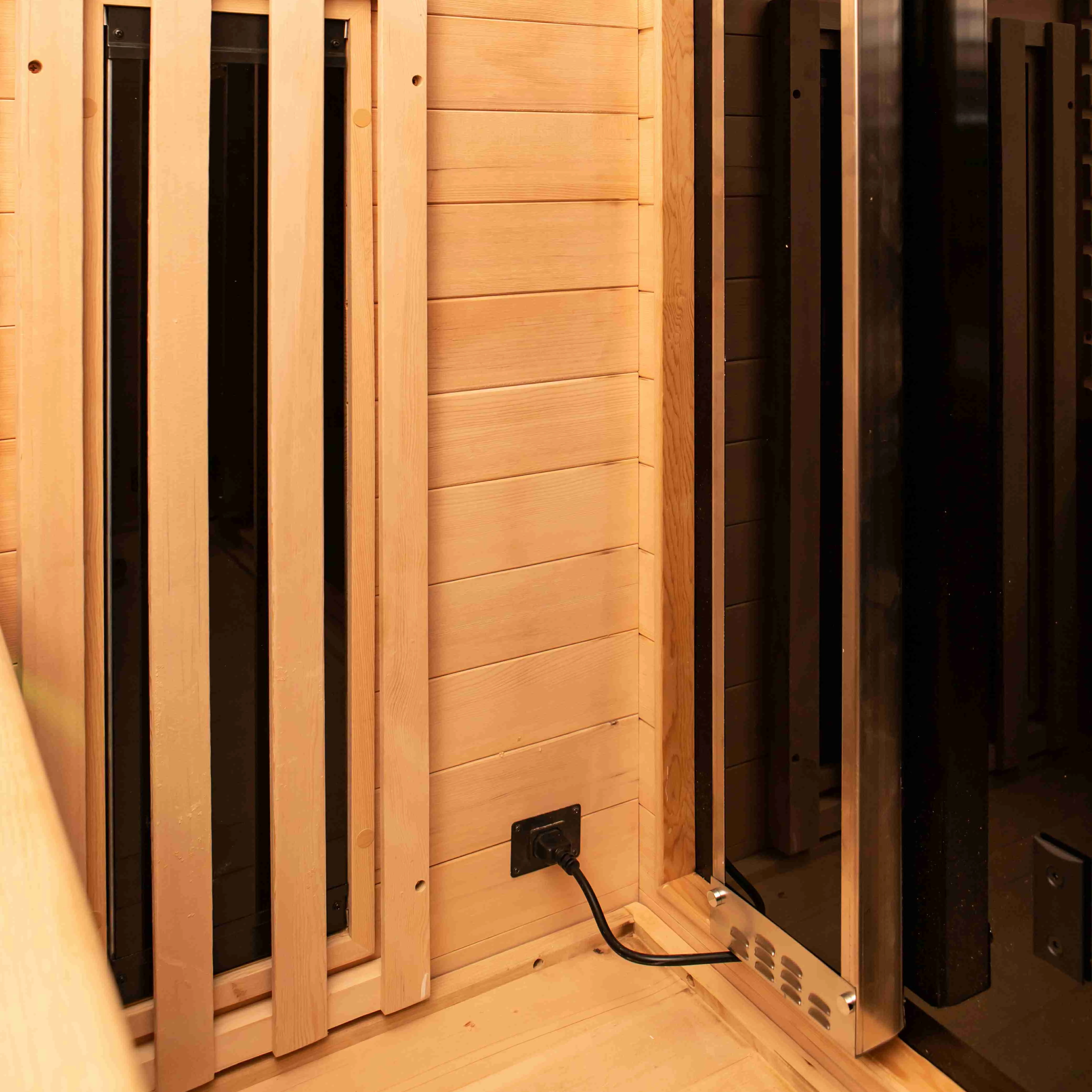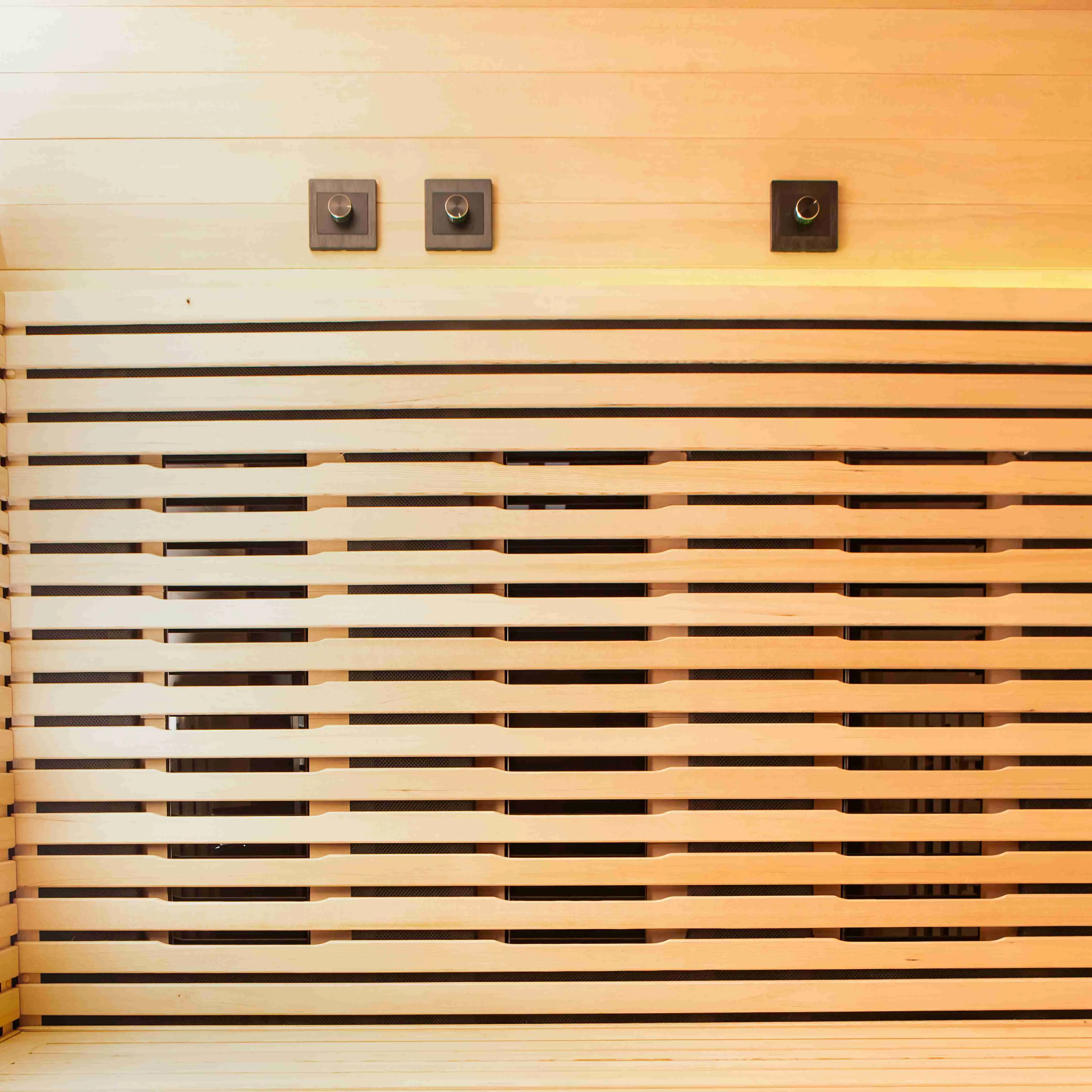 Каркас и внутренняя часть изготовлены из прочной сосны тсуга, что придаёт им тёплый, естественный вид, гармонирующий с выразительным стеклом. Тсуга — это долговечная древесина с низким содержанием смолы, которая остаётся приятной на ощупь даже при нагреве. Дерево тщательно отшлифовано и аккуратно собрано, обеспечивая гладкую внутреннюю поверхность, удобную для сидения. Конструкция скамьи просторная и надёжная, с закруглёнными краями для комфорта и безопасности. Электрические элементы управления легко доступны и просты в использовании, с чёткими дисплеями температуры и времени. Вы можете установить работу сауны по таймеру и выбрать комфортный уровень нагрева. Система быстро нагревается и поддерживает постоянное, мягкое тепло